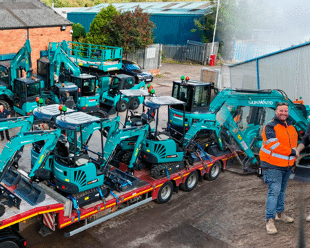 30 September 2025Midlands plant hire specialists Chase Plant Hire have doubled their fleet of Sunward machines. The Walsall-based company, which is celebrating 35 years in business, and has two depots – in Bloxwich, Walsall, and in Burntwood, Staffordshire – had already purchased nine Sunward skid steers from Sunward dealer Hamstead Plant. These are hired out for work on farm yards, concrete yards and for precious metal reclamation. It has now enhanced the skid steers with a total of nine Sunward mini-excavators – six SWE 18UF four-pole canopy minis, two SWE ...
